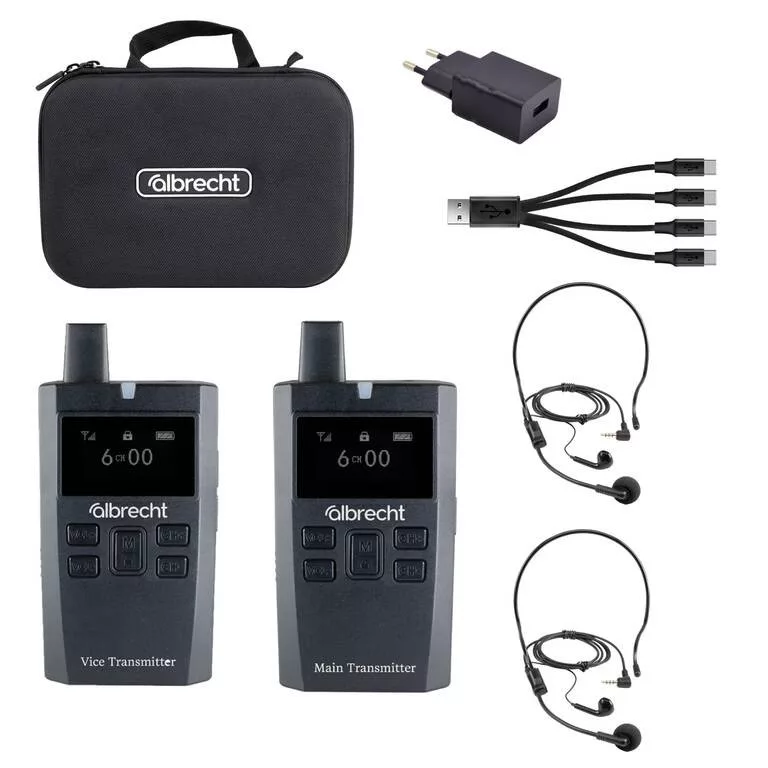 Az Albrecht 2 db-os Albrecht Multicom 2 idegenvezető rádió szett vezeték nélküli, teljes duplex kommunikációt kínál akár 5 felhasználó számára, miközben további 94 hallgató csatlakozhat a beszélgetéshez. A költséghatékony rendszer díjak nélkül működik, és egyszerű kezelést biztosít, ideális kültéri és beltéri használatra.