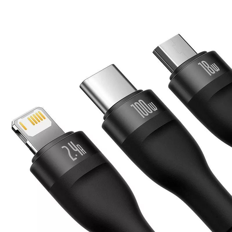 A 3 az 1-ben USB kábelt a Baseus Flash Series 3 csatlakozóval rendelkezik - USB-C, lightning és micro USB.