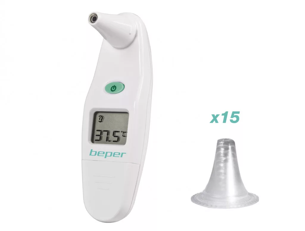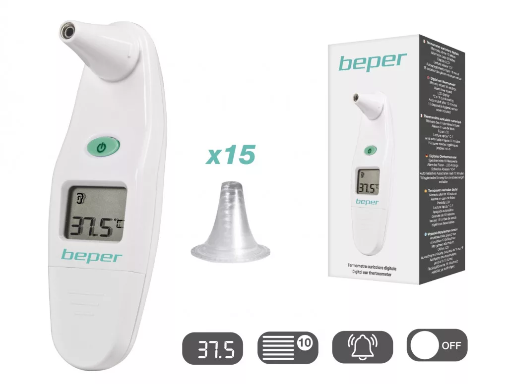 Digitális fülhőmérés infravörös technológiával-Hangjezés amikor a készülék használatra kész, illetve láz esetén-Hőmérséklet kijelzés Celisus vagy Fahrenheit értékben-Mérési tartomány 32-43 °C. között-Folyadék kristályos kijelző-Memóriahely az utolsó 10 mérési értéknek-A csomag tartalmaz 15db higiénikus műanyag mérő kupakot