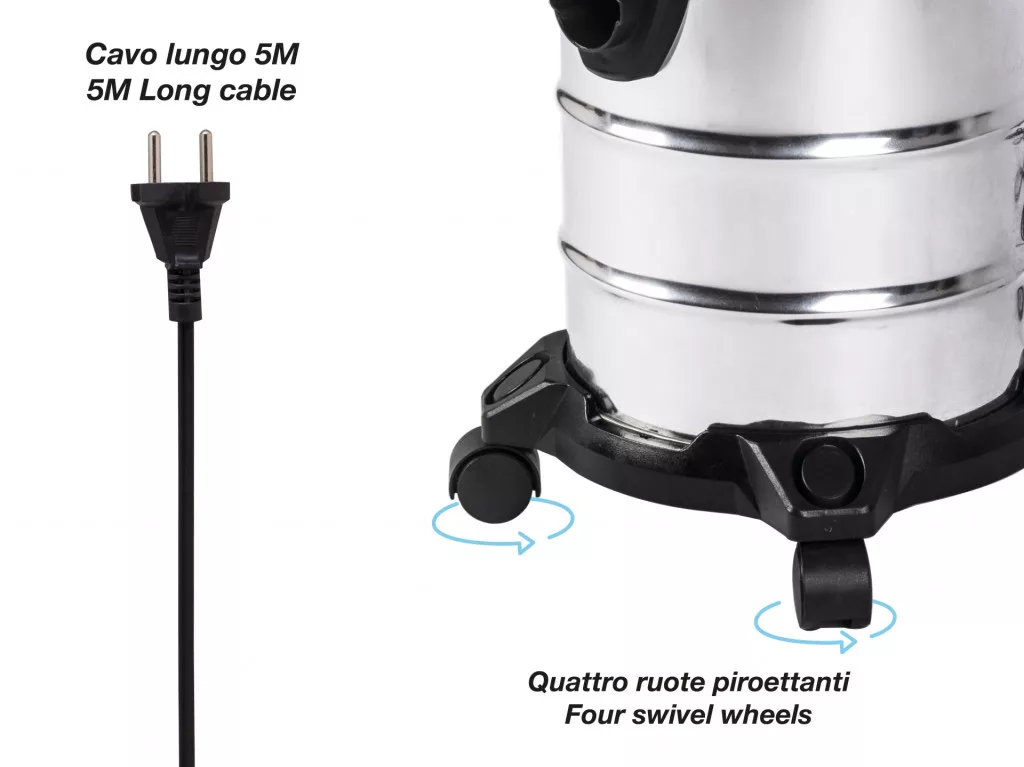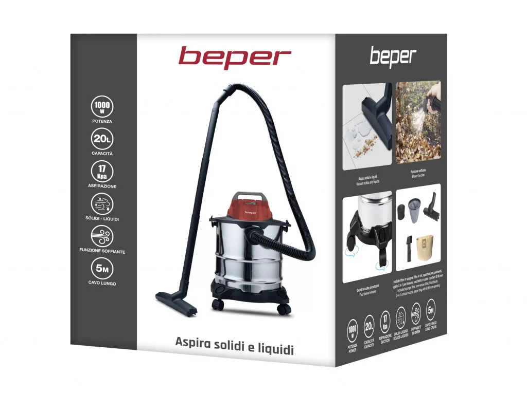 20 literes tartálya felszívja a szennyeződéseket és a folyadékokat, az erős 1000W-os motor megkönnyíti a finom és durva szennyeződések és folyadékok felszívását. Erős szívásteljesítmény 17 Kpa felett, valamint fúvó funkció. Egyszerű mozgatás és használat, rekeszek a tartozékok tárolására. A készlet tartalmazza: szivacsszűrő, gyapjúszűrő, padlókefe, 2 az 1-ben résszívófej, papírzacskó 56 mm átmérőjű nyílással. Főbb jellemzői: