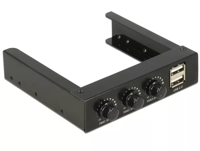 Ez a Delock elülső panel egy számítógép szabad, 3.5 bővítőhelyére telepíthető. A panelen két USB 2.0-s port található, ezenkívül három elforgatható gomb a ventilátor vezérléséhez.
