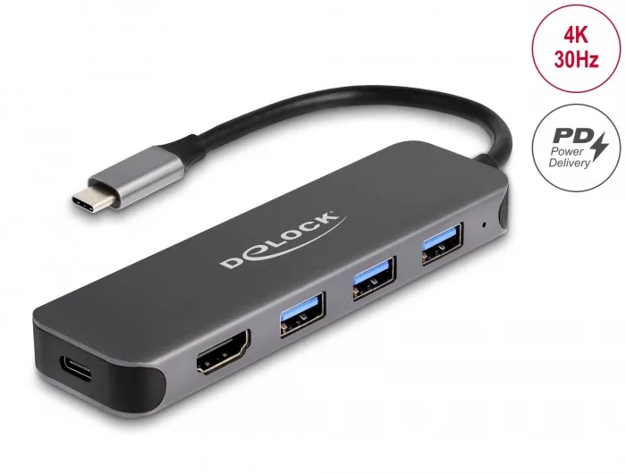 A Delock USB elosztója a USB Type-C kapcsolattal rendelkező laptopok, okostelefonok és tabletek mobilitás társa. Az elosztóhoz akár 3 A-típusú USB eszköz is csatlakoztatható. Egy képernyő üzemeltethető a HDMI kimeneten egy akár 4K 30 Hz mértékű maximális felbontással.