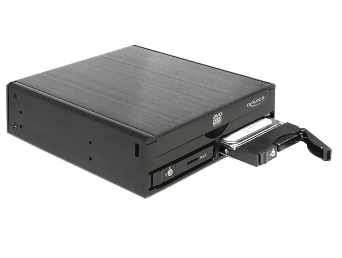 Ezt a Delock mobil beépítő keretet (mobil rack) a számítógépház egy szabad, 5.25 meghajtó helyébe lehet beszerelni. A kerethez egy keskeny (slim) kivitelű meghajtó és két 2.5 -os SATA merevlemez is rögzíthető. A hot plug funkció lehetővé teszi a merevlemez-meghajtó működés közbeni cseréjét.