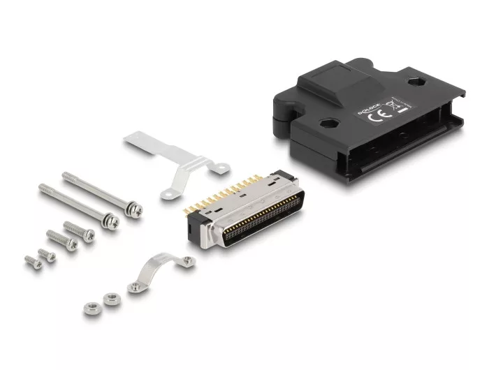Leírás Ez a Delock borított MDR (Mini D Ribbon) apa forrasztó kapcsolattal használható kábel beszereléshez és I/O applikációkhoz. Házzal történő védelem A műanyag keret megvédi az apa csatlakozót a kosztól és sérüléstől. Túlfeszülés védelem A becsavarozható tehermentesítő rögzíti a kábelt a házban. Műszaki adatok Csatlakozó: 1 x MDR 50 apa (2 soros) forrasztó kapcsolattal Vezetékek középvonala közötti távolság: 1,27 mm 30 24 AWG vezetékméretű kábelekhez használható Kapcsolódó felület borítása: arany bevonat, nikkel bevonat Működési hőmérséklet: -25 C ~ 85 C Tűzállósági besorolás: 94V-0 Burkolat anyaga: műanyagból Méretek (HxSzxM): kb. 50,0 x 41,1 x 12,7 mm A csomag tartalma MDR apa 2 részes ház 2 részes feszülés csökkentés 4 x csavar 2 x rögzítő csavar 2 x anyacsavar Csomag Poly bag