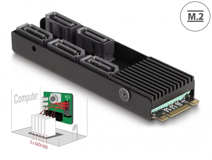 Ez a Delock átalakító kibővíti a rendszert öt SATA porttal. Különböző eszközök úgy, mint SSD-k, merev lemezek, DVD-meghajtók köthetők az átalakítóba. Az M.2 modul körüli hűtőborda biztosítja az optimális hőmérsékletet működés közben. -Csatlakozó: 1 x 59 tűs M.2 B+M-kulcs dugó 5 x 7 érintkezős SATA 6 Gb/s dugó -Lapkakészlet: JMicron JMB585 -Csatolófelület: PCIe -Formatényező: M.2 2280 -M vagy B nyílással ellátott, PCIe alapú M.2 aljzathoz megfelelő -Akár 6 Gb/s sebességű adatátvitel -Támogatja a Native Command Queuing (NCQ) technológiát -Támogatja a S.M.A.R.T. használatát -Támogatja a TRIM használatát -Támogatja a DevSleep használatát -Hot Swap -Rendszerindításra alkalmas -Méretek (HxSzxM): kb. 80 x 23 x 10 mm -Linux Kernel 5.11 vagy újabb -Windows 8.1/8.1-64/10/10-64/11 -Egy szabad M.2 aljzat M vagy B nyílással -Átalakító -2 x hab párna -Használati utasítás
