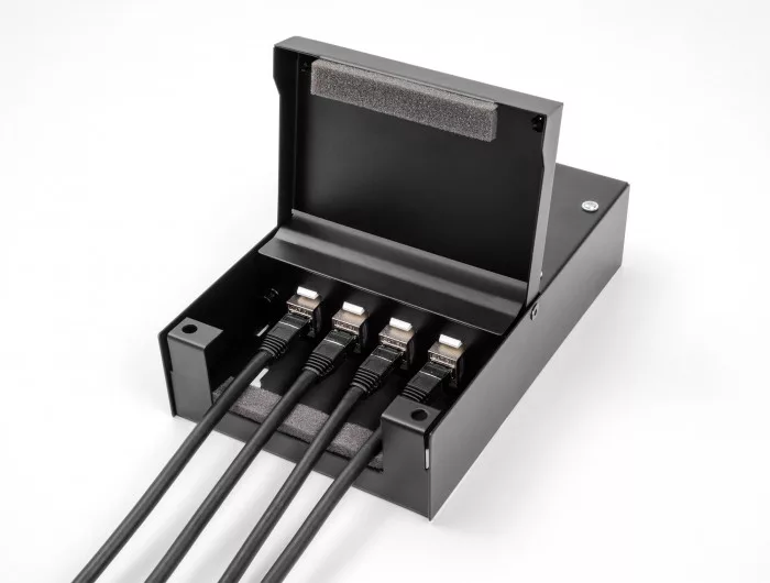 Leírás Ez a Delock elosztódoboz 4 Keystone modul telepítésére használható, és gyűjtőpontként szolgál a strukturált hálózati kábelezéshez épületekben vagy ipari területeken. A doboz falra, mennyezetre vagy padlóra szerelhető, és asztali változatként is használható. Csuklós fedél a könnyű felszereléshez Az elosztódoboz csuklós fedéllel rendelkezik, amely szerszám nélkül nyitható, és lehetővé teszi a patch kábelek egyszerű csatlakoztatását. Kábelbevezetés elöl és hátul IP20 védelmi osztály szerint A két kábelbevezetés elöl és hátul is védett pl. por ellen az IP20 védelmi osztálynak megfelelően. Leírás Elosztódoboz strukturált kábelezéshez 4 nyílás a Keystone modulokhoz Falra szerelés: Rögzítési furat átmérője: kb. 4,2 mm A csavarlyuk osztása: kb. 134,8 mm Kábelbevezetés elöl és hátul Csuklós fedél a könnyű felszereléshez Védettség: IP20 Szín: fekete Anyaga: fém Méretek (HxSzxM): kb. 203 x 134 x 58 mm A csomag tartalma Elosztó szekrény 8 x kábelkötegelő 4x csavar 4 x tiplik Csomag Doboz