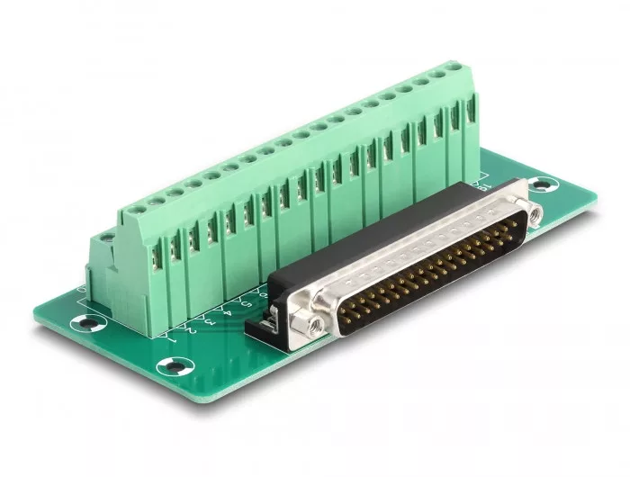 Leírás Ez a Delock sorkapocs-adapter lecsupaszított végű vezetékek csatlakoztatására használható. DIN sínre szerelés A szállítási tartalomban található kapcsokkal az adapter 15 mm vagy 35 mm széles DIN sínre rögzíthető. Leírás Csatlakozók: 1 x D-Sub 37 tűs apa 1 x 38 tűs sorkapocs Tűk kiosztása: 1:1 Oszlás: 5,00 mm Használható 24-12 AWG kábelhosszúsághoz DIN sínre szerelés: 15 mm és 35 mm Üzemi hőmérséklet: -40 C ~ 100 C Méretek (HxSzxM): kb. 116 x 51 x 30 mm Rendszerkövetelmények Egy szabad D-Sub 37 tűs anya 15 mm vagy 35 mm DIN sín A csomag tartalma Adapter 2 x DIN sín kapocs 5 x csavar Csomag Fehér doboz
