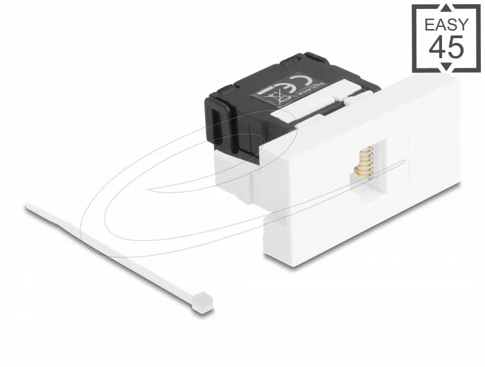 Leírás Ezt a Delock Easy 45 modult úgy tervezték, hogy hálózati kábelportot biztosítson , és csatlakoztatható a Delock Easy 45 modulrendszerhez. Az egyszerű bepattintható mechanizmus biztosítja, hogy a modul szilárdan a helyén legyen, és szükség esetén könnyen eltávolítható. Könnyű 45 csatlakoztatás Az Easy 45 egy változtatható, moduláris rendszer, amely lehetővé teszi olyan komponensek használatát, mint az aljzatok, HDMIvagy USB-csatlakozások bővíthetők az Ön igényei szerint. Az Easy 45 modulok szabványosak és különféle modultartókba vagy kábelcsatornákba szerelhetők. Az Easy 45 interfészt épít az elektromos, hálózati és rendszertelepítés, valamint számos perifériaeszköz, például TV, monitorok, nyomtatók, laptopok és még sok más között. Műszaki részletek Csatlakozók: 1 x RJ45 jack 1 x LSA 180 (szerszám nélküli) Cat.6A specifikáció Árnyékolatlan (UTP) TIA-568A/B kivezetés Tömör vagy sodrott huzalhoz (26-22 AWG) 6,0 - 8,5 mm átmérőjű kábelekhez Alkalmas a Delock Easy 45 modultartóhoz Modul mérete: 22,5 x 45 mm Méretek (HxSzxH): kb. 22,5 x 45,0 x 40,3 mm Szín: fekete/fehér A csomag tartalma Easy 45 modul Kábelkezelő Cipzáras nyakkendő Csomag Cipzáras poli táska