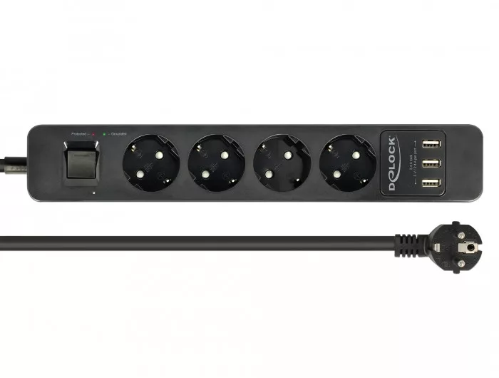 A Delock négy foglalatú hosszabbítós konnektor USB töltovel kényelmes csatlakoztatást biztosít különbözo eszközöknek közvetlenül az asztalon. A beépített kisülés védelem megóvja az eszközöket viharban vagy áramszünet esetén.