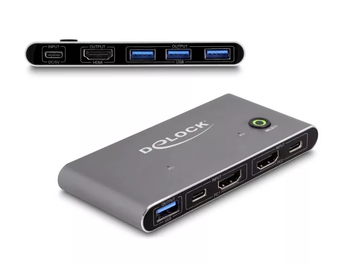 Leírás Ez a Delock KVM switch kényelmes megoldás két HDMI kimenettel rendelkező számítógép egy HDMI monitorral való összekapcsolására. A kapcsoló használatával válthat a két számítógép között. Perifériák Továbbá, négy USB 5 Gbps port csatlakoztatható egérhez, klaviatúrához vagy USB-s táregységhez. Műszaki adatok Csatlakozó: Bemenet: 2 x HDMI-A hüvely 2 x USB 5 Gbps USB Type-C hüvely 1 x USB Type-C hüvely (5 V tápellátás) Kimenet: 1 x HDMI-A hüvely 4 x USB 5 Gbps A-típusú hüvely Kapcsoló gomb LED forráskijelző Akár 5 Gbps sebességű adatátvitel Felbontás: 7680 x 4320 @ 60 Hz 3840 x 2160 @ 144 Hz (a rendszertől és csatlakoztatott hardvertől függően) Fémburkolat Szín: antracit Méretek (HxSzxM): kb. 115 x 54 x 12 mm Operációs rendszertől független, illesztőprogram telepítése nem szükséges Rendszerkövetelmények Személyi számítógép anya HDMItal + USB A-típusú anya Monitor vagy televízió HDMI-csatlakozóval HDMI-kábel Áramforrás egy szabad USB A-típusú anya csatlakozó A csomag tartalma KVM kapcsoló USB 2 x kábel USB 5 Gbps, A-típusú csatlakozódugóval és USB 5 Gbps-s, USB-C -típusú csatlakozódugóval,hossza kb. 100 cm Kábel USB-C csatlakozódugóval és USB A-típusú csatlakozódugóval, hossza kb. 100 cm (tápellátás) Használati utasítás Csomag Retail Box