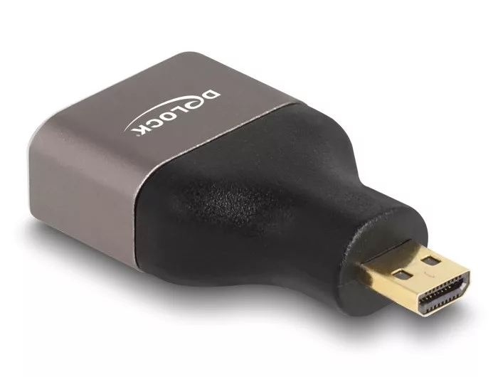 Leírás Ezzel a Delock HDMI adapterrel összekapcsolhat egy meglévő HDMI kábelt egy HDMI Micro-D portos eszközzel, mint például egy televízióval vagy egy monitorral. Műszaki adatok Csatlakozó: 1 x HDMI Micro-D dugó 1 x HDMI-A hüvely High Speed HDMI with Ethernet (HEC) specifikáció Fémburkolat Arany bevonatú érintkezők Felbontás: max. 7680 x 4320 @ 60 Hz (a rendszertől és csatlakoztatott hardvertől függően) Méretek (HxSzxM): kb. 35,0 x 19,2 x 9,4 mm Szín: fekete / szürke Rendszerkövetelmények Egy szabad HDMI Micro-D csatlakozás A csomag tartalma HDMI adapter Csomag Zárható műanyag tasak
