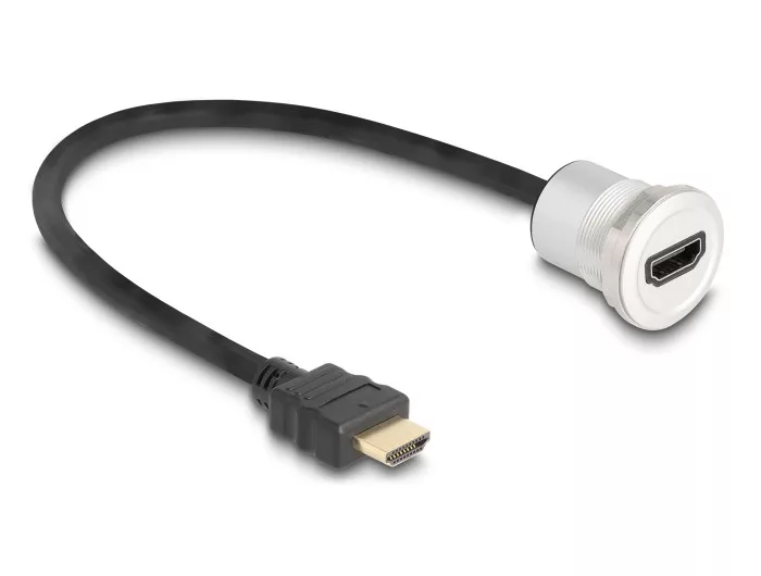 Leírás Ez a Delock kábel használható például egy panelbe vagy házba történő illesztéshez, amennyiben megfelelő nyílás elérhető. Továbbá használható különböző HDMI eszközök kibővítésére és összekapcsolására. Műszaki adatok Csatlakozó: 1 x HDMI dugó 1 x HDMI hüvely installációhoz Menet típus: M25 Beépített nyílás átmérője: 26,7 mm Kábel vastagsága: 30 AWG Felbontás: max. 7680 x 4320 @ 60 Hz (a rendszertől és csatlakoztatott hardvertől függően) Arany bevonatú érintkezők Kábelátmérő: kb. 6 mm Szín: fekete / ezüst Hosszúság a csatlakozóval együtt: kb. 30 cm A csomag tartalma HDMI-kábel Csomag Zárható műanyag tasak