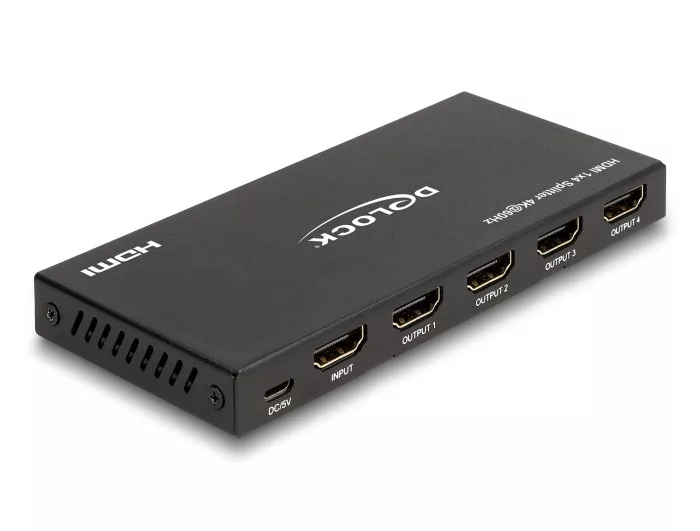 Leírás Ez a Delock gyártmányú elosztó HDMI-jelet fogad egy asztali vagy hordozható számítógépről, és a jelet négy csatlakoztatott kijelzőre osztja el. Ennek köszönhetően négy HDMI-monitor működtethető egy HDMI-csatlakozóval. Mérséklő Amennyiben egy monitor nem támogatja a magas felbontást, a kép leminősíthető 4K-ról 1080p-re a beépített mérséklő segítségével. USB tápellátás Az eszközt USB porton keresztül lehet tölteni, egy alkalmas USB kábel csatolva van. Amennyiben nincs szabad A-típusú USB port, egy opcionális külső tápellátás szükséges. Műszaki adatok Csatlakozó: Bemenet: 1 x HDMI-A hüvely 1 x USB Micro-B típusú hüvely (5 V tápellátás) Kimenet: 4 x HDMI-A hüvely Támogatja az EDID management High Speed HDMI specifikáció 3D megjelenítők támogatása Támogatja a HDR használatát Támogatja a HDCP 1.4 és 2.2 használatát Funkciók: Tükrözött Hang- és videojelek továbbítása Minden közismert 2.0-s és 5.1-es hangformátum használatát támogatja: LPCM, Dolby Digital, DTS Audio Felbontás: max. 3840 x 2160 @ 60 Hz (a rendszertől és csatlakoztatott hardvertől függően) Videó sávszélesség akár 600 MHz / 6 Gbps csatornánként, max. 18 Gbps Energiafogyasztás: max. 2,5 W Robusztus fémház Szín: fekete Méretek (HxSzxM): kb. 136 x 61 x 14 mm Rendszerkövetelmények HDMI-kábel Áramforrás egy szabad USB A-típusú anya csatlakozó A csomag tartalma HDMI-elosztó USB-tápkábel, hossza: kb. 0,75 m Használati utasítás Csomag Retail Box