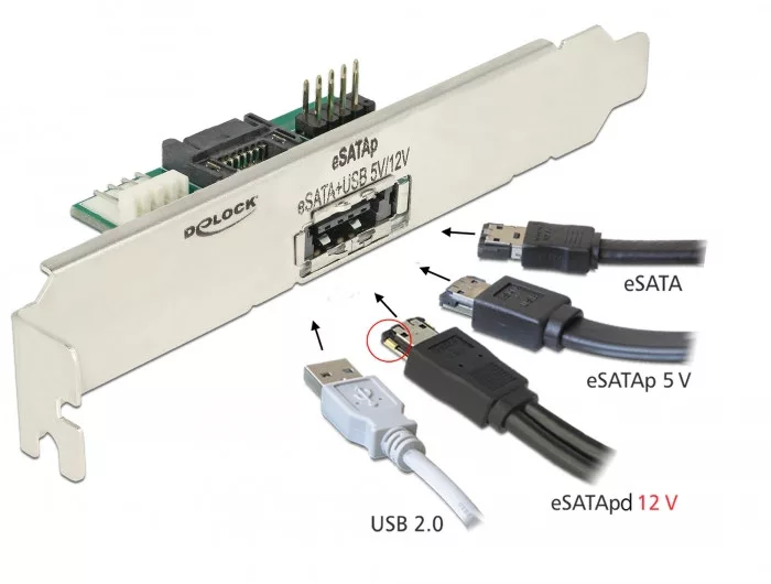 Ezzel a Delock csatlakoztató kerettel egy személyi számítógép hosszabbítható meg egy külső Power Over eSATA szabványú porttal. Így különböző eszközöket eSATApd, eSATAp, eSATA vagy szabványos USB csatlakozóval köthetünk hozzá. Az eSATApd port 5 V és 12 V-os áramforrást biztosít, ezért egy 2.5 és 3.5 merevlemez kapcsolható össze speciális Delock termékek, mint például eSATApd kábel segítségével. A mellékelt kábelek belső kapcsolat kialakítására alkalmasak.