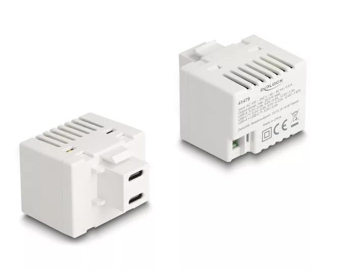 Leírás Ez a Delock modul két USB Type-C PD (tápellátó) töltő portot biztosít. Az USB töltő portok támogatják az átlagos gyorstöltő módozatokat. A csatlakoztatott eszközök akár 20 W-tal is tölthetők. Szabványos méretének köszönhetően egyszerű rögzítésre használható (pl. Keystone patch panelhez, védőlemezhez vagy felületre szerelhető dobozhoz). Műszaki adatok Csatlakozó: 2 x USB Type-C hüvely 1 x 2 tűs csatlakozóblokk Bemenet: AC 100 ~ 240 V / 50 ~ 60 Hz / 0,6 A Kimeneti teljesítmény: összesen max. 20,0 W USB-C 1: 5,0 V / 3,0 A, 9,0 V / 2,22 A, 12,0 V / 1,67 A USB-C 2: 5,0 V / 3,0 A, 9,0 V / 2,22 A, 12,0 V / 1,67 A USB-C 1 + USB-C 2: 5,0 V / 3,0 A Aktív üzemmódban mért átlagos hatásfok 86,8 % Hatásfok alacsony (10 %-os) terhelésnél 75,1 % Üresjárási üzemmódban mért energiafogyasztás 0,1 W Rövidzár elleni védelem 19,2 x 14,9 mm-es Keystone csatlakozóportokhoz Szín: fehér Méretek (HxSzxM): kb. 44,7 x 41,2 x 32,5 mm A csomag tartalma Keystone modul Használati utasítás Csomag Retail Box