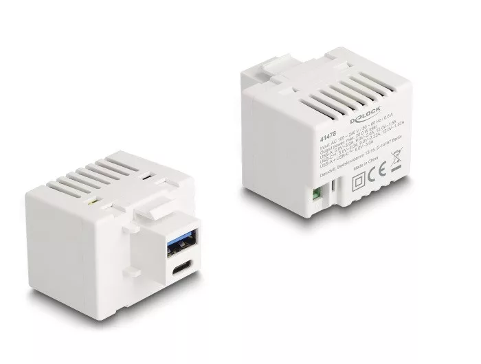 Leírás Ez a Delock modul egy A-típusú USB és egy USB Type-C PD (tápellátó) USB töltő portot nyújt. Az USB töltő portok támogatják az átlagos gyorstöltő módozatokat. A csatlakoztatott eszközök akár 20 W-tal is tölthetők. Szabványos méretének köszönhetően egyszerű rögzítésre használható (pl. Keystone patch panelhez, védőlemezhez vagy felületre szerelhető dobozhoz). Műszaki adatok Csatlakozó: 1 x USB Type-C hüvely 1 x USB A-típusú hüvely 1 x 2 tűs csatlakozóblokk Bemenet: AC 100 ~ 240 V / 50 ~ 60 Hz / 0,6 A Kimeneti teljesítmény: összesen max. 20,0 W USB-A: 5,0 V / 3,0 A, 9,0 V / 2,0 A, 12,0 V / 1,5 A USB-C : 5,0 V / 3,0 A, 9,0 V / 2,22 A, 12,0 V / 1,67 A USB-A + USB-C : 5,0 V / 3,0 A Aktív üzemmódban mért átlagos hatásfok 86,8 % Hatásfok alacsony (10 %-os) terhelésnél 75,1 % Üresjárási üzemmódban mért energiafogyasztás 0,1 W Rövidzár elleni védelem 19,2 x 14,9 mm-es Keystone csatlakozóportokhoz Szín: fehér Méretek (HxSzxM): kb. 44,7 x 41,2 x 32,5 mm A csomag tartalma Keystone modul Használati utasítás Csomag Doboz