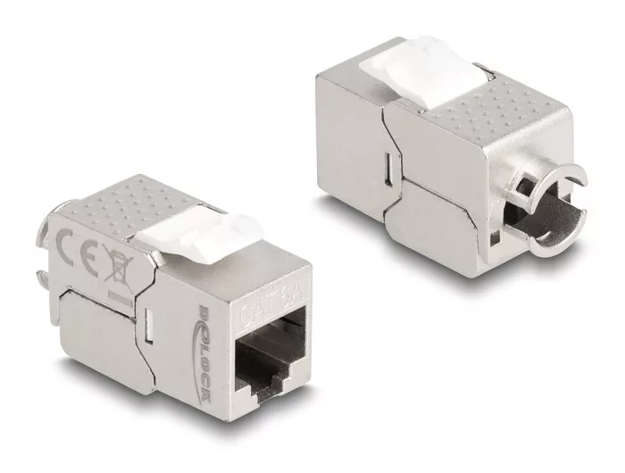 Leírás Ez a Delock modul használható hálózati kábel összekapcsolására és könnyen, rácsattintható módszerrel rögzíthető különböző tartókra, például keystone patch panelekre, védőlemezekre vagy surface-mount box-okra. Műszaki adatok Csatlakozó: 1 x RJ45 anya (8P/8C) > 1 x LSA (szerszám nélkül szerelhető) Cat.6A specifikáció Váz (STP) TIA-568A/B bekötés Tömör és sodrott huzalhoz (26 - 22 AWG) A kábel átmérője 5,0 - 8,0 mm 19,2 x 14,9 mm-es Keystone csatlakozóportokhoz Anyaga: cink öntvény Szín: ezüst / fehér Méretek (HxSzxM): kb. 34,5 x 21,5 x 19,0 mm A csomag tartalma Keystone modul Kábelkezelő Kábelkötegelő Csomag Zárható műanyag tasak