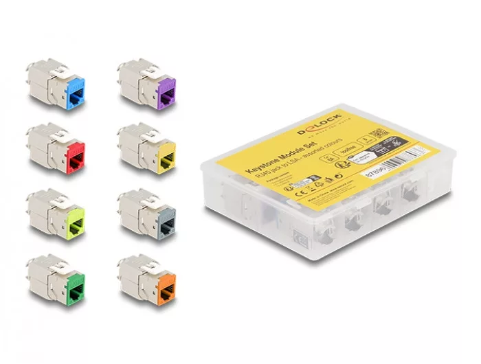 Leírás Ezek a Delock Keystone modulok használhatók hálózati kábelek összekapcsolására és alkalmasak egyszerű bepattintós foglalatba különböző helyekre, úgy, mint keystone patch panelekbe, előlapokba vagy felszínbe süllyesztett dobozokba. Különböző színekkel A szett magában foglal 8 Keystone modult különböző színekben a jobb azonosítás és átláthatóság érdekében mint például egy hálózati kabinetben. Műszaki adatok Csatlakozó: 1 x RJ45 hüvely 1 x LSA (szerszám nélkül szerelhető) Cat.6A specifikáció Árnyékolt TIA-568A/B bekötés Tömör és sodrott huzalhoz (24 - 22 AWG) 9,5 mm-es kábelátmérőhöz 19,2 x 14,9 mm-es Keystone csatlakozóportokhoz Anyaga: cink öntvény Színek: szürke, kék, zöld, narancssárga, piros, sárga, lila, neon sárga Méretek (HxSzxM): kb. 39,5 x 19,6 x 16,7 mm A csomag tartalma 8 x Keystone modul 8 x Kábelkezelő 8 x kábelkötöző Csomag Doboz