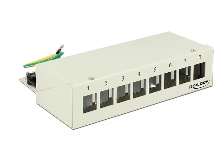 Ez a Delock által gyártott patch panel falra szerelt vagy szekrényekben elhelyezett csatlakozódobozként használható. Ezenkívül a DIN-sínre való rögzítéshez szükséges klipszeket is tartalmazza. Szabványosított méreteivel nyolc Keystone modul egyszerű pattintható beépítésére alkalmas.