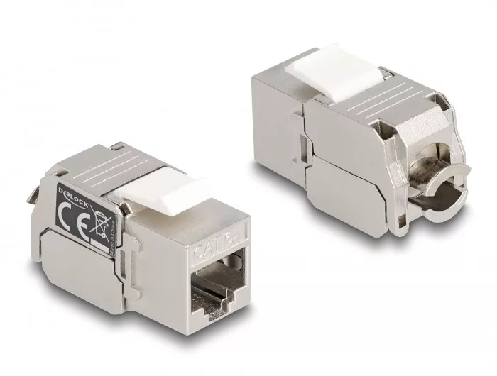 Ez a Delock modul használható hálózati kábel összekapcsolására és könnyen, rácsattintható módszerrel rögzíthető különböző tartókra, például keystone patch panelekre, védőlemezekre vagy surface-mount box-okra. LEDdel Egy LED van beépítve a Keystone modulba egyszerűbbé téve a modul megtalálását egy patch panelben a kábel tesztelőt használva. A kábel tesztelőtől függően a LED zöld vagy piros fénnyel gyullad ki. -Csatlakozó: 1 x RJ45 hüvely (8P/8C) > 1 x LSA 180 (szerszám nélkül szerelhető) -Cat.6A specifikáció -LED jelző: zöld (aktív) / piros (passzív) -Árnyékolt (STP) -TIA-568A/B bekötés -Tömör és sodrott huzalhoz (24 - 22 AWG) -19,2 x 14,9 mm-es Keystone csatlakozóportokhoz -Anyaga: cink öntvény / műanyagból -Szín: ezüst / fehér -Méretek (HxSzxM): kb. 38 x 20 x 16 mm -Keystone modul -Kábelkötegelő