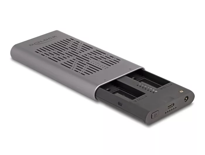 Leírás Ez a Delock alumínium ház lehetőséget ad két M.2 PCIe NVMe SSD telepítésére 2280, 2260 és 2242 formátumban. USB-n keresztül csatlakoztatható a számítógéphez vagy a laptophoz. M.2 PCIe SSD klón funkció A klón funkcióval lehetséges egy SSD tartalmát átmásolni egy másikra személyi számítógép használata nélkül. SSD beépítés eszköz nélkül Ennek a külső háznak az a különlegessége, hogy az M.2 SSD beszereléséhez nincs szükség szerszámokra. A záró mechanizmus megakadályozza a ház véletlenszerű, nem szándékolt kinyílását például utazás folyamán táskában. Jó hűtés Egy ventilátor a ház alján biztosítja a megfelelő hűtését a használatban lévő SSD-knek, így zárt kerettel is probléma nélkül működnek. Műszaki adatok Csatlakozó: külső: 1 x USB 20 Gbps USB Type-C hüvely 1 x DC aljzat belső: 2 x M.2 M-kulcs nyílás Lapkakészlet: JMicron JMS586U M.2 modulok használatát támogatja 2280, 2260 és 2242 formátumban PCIe (NVMe) alapú M- vagy B+M-kulccsal Az összetevők maximális magassága a modulon: A kétoldalas összeszerelt modulok 1,5 mm-es alkalmazása támogatott Támogatja a NVM Express (NVMe) használatát Támogatja a S.M.A.R.T. használatát Támogatja a TRIM használatát Támogatja a UASP használatát Akár 10 Gbps sebességű adatátvitel 1 x klónozó gomb 1 x reteszelő váltás LED jelzőlámpa tápellátás, hozzáférés és másolás állapota Hot Plug, Plug & Play Rendszerindításra alkalmas Fémburkolat Beépített 30 mm-es ventilátor Szín: szürke Méretek (HxSzxM): kb. 143 x 77 x 18 mm A tápegység műszaki adatai Fali tápegység Bemenet: AC 100 ~ 240 V / 50 ~ 60 Hz / 0,6 A Kimenet: 12,0 V / 2,0 A / 24,0 W Földelés kívül, pozitív belül Méret: belül: o kb. 2,5 mm kívül: o kb. 5,5 mm hosszúság: kb. 10 mm Rendszerkövetelmények Android 11.0 vagy újabb Chrome OS Linux Kernel 5.15 vagy újabb Mac OS 13.1 vagy újabb Windows 10/10-64/11 iPad Air (4. generáció) vagy újabb iPad Pro (3. generáció) vagy újabb Surface Pro 7 Egy szabad USB Type-C porttal vagy egy szabad Thunderbolt 3 porttal rendelkező eszköz vagy Thunderbolt 4 A csomag tartalma Külső ház Kábel USB-C csatlakozódugóval és USB-C csatlakozódugóval, hossza kb. 60 cm Külső tápegység 2 x hővezető betét 2 x hővezető lemez 4 x gumi csődugó Használati utasítás Csomag Retail Box