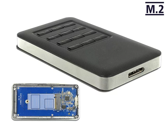 Ez a Delock merevlemezház egy 2242 vagy 2230 formátumú M.2 SSD telepítését teszi lehetové, és USB A-típusú csatlakozón keresztül csatlakoztatható egy asztali vagy hordozható számítógéphez. A tetején lévo gombok segítségével titkosítani lehet egy partíciót a beépített tárterületen.
