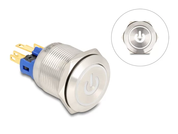 Leírás Ez a Delock nyomógomb ideális kontrollpanelbe történő beszereléshez, például iőari felhasználásra kontroll vagy szabályozó technológiai eszköz esetén. Nyomó gombokat használnak még az autóiparban vagy felhasználó szektorban. Például kapucsengőként vagy a világítási rendszer kapcsolójaként időzítőkkel, melyeket például folyosókon is alkalmaznak. Gomb Egy úgy nevezett gomb, vagy nyomógomb visszatér eredeti állapotába/helyzetébe megnyomás után. Nyitó és záró A NO (záró) kapcsoló létrehoz érintkezést két kapcsolat között, míg az NC (nyitó) kapcsoló szétengedi azokat. Műszaki adatok Csatlakozó: 6 x forrasztott csatlakozás Kapcsoló típus: 1NO + 1 NC Kapcsoló feszültség: AC 230 V~ / 3 A Kontaktok száma: 3 Nyílt kontaktok száma: 1 Funkció: időszakos Billentyű: lapos Működési hőmérséklet: -25 C ~ 55 C Rögzítési furatátmérő: kb. 22 mm Hatlaú csavarkulcs szélessége: 25 mm Szerelési mélység: kb. 39 mm Csavarmenet méret: M22 LED fény: fehér LED volt érték: 12 V LED típusa: bekapcsolási szimbólum + gyűrű Anyag: nikkelezett rozsdamentes acél Mechanikus élettartam: 1.000.000 ciklus Elektromos szolgáltatás élettartama: 100 000 kör Védelmi besorolás: IP65 Méretek (H x M): kb. 45 x 30 mm Csomag Retail Box
