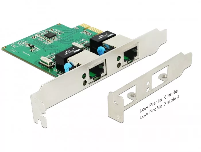 A Delock PCI Express-kártya két hálózati portot biztosít max. 1000 Mbps adatátviteli sebességgel.