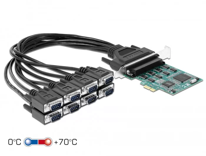 A Delock PCI Express kártya 8 külső soros RS-232 porttal bővíti a számítógépet. Különböző eszközök, úgy mint szkenner, protokoll átalakító vagy IoT elemek, kapcsolhatók ehhez a kártyához.