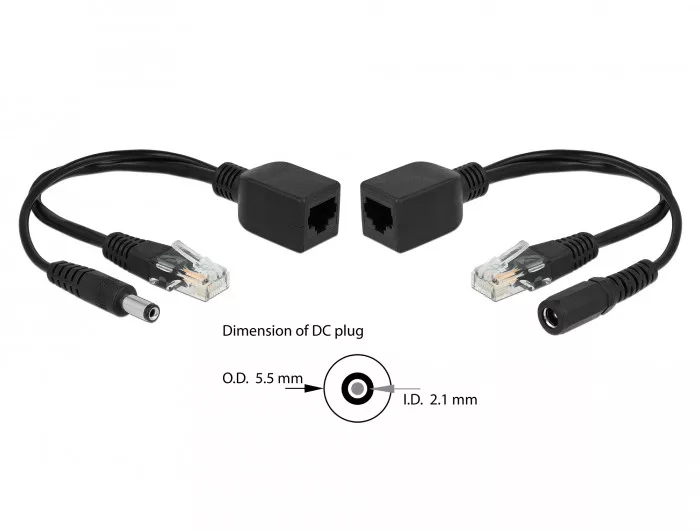 Ezzel a Delock adapter készlettel egy hálózati kábel használható egy 10/100 Mbps Ethernet csatlakozáshoz és egyidejű áramellátáshoz. Ehhez a két adaptert a kábelhez kell csatlakoztatni. Ezután mindkét oldalon egyenáramú aljzat és dugó biztosított egy tápegység csatlakoztatásához.