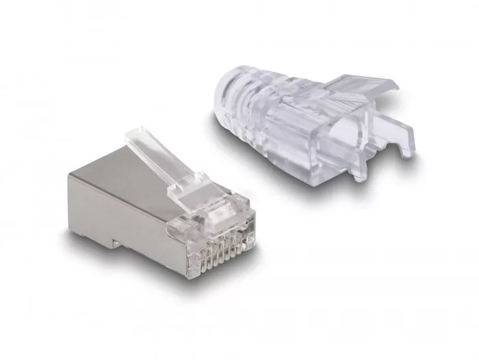 Ez a Delock jó minőségű RJ45 csatlakozó szett magában foglal borított RJ45 csatlakozókat frontális nyílással és megfelelő hajlítás védő borítással, hogy optimálisan rendezze a kábeleket 26 - 23 AWG.
