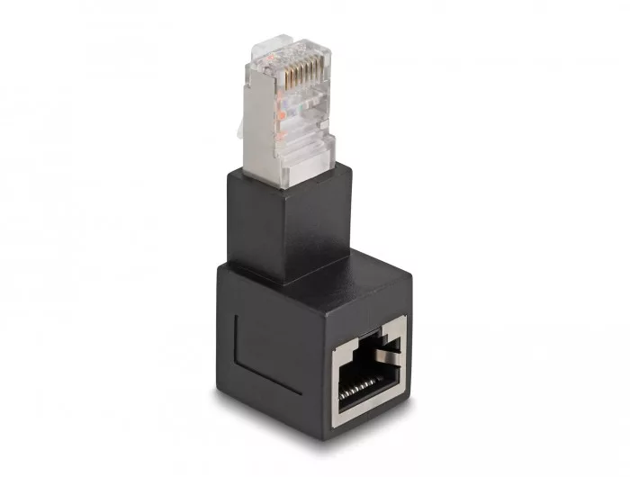 Ezzel a Delock adapterrel az eszköz RJ45 anya csatlakozója 90 -os szögben hajtható el. Ez teszi lehetővé, hogy rögzítsünk hálózati kábeleket nehezen elérhető helyeken és megvédjük az eszköz csatlakoztatóját a sérüléstől, a kábelt hajlítás miatti megtöréstől.