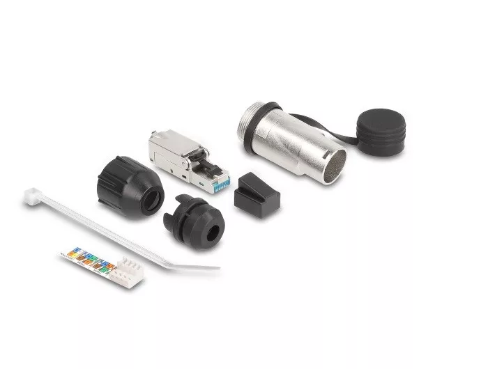 Leírás A Delock RJ45 dugaszoló szerelvény hálózati kábelek csatlakoztatására használható. A csatlakozó gyors és könnyű összeszerelést biztosít és biztonságos kábelkapcsolatot nyújt. Kábel csatlakozási házzal és védő sapkával A ház használható kapcsolószekrényekben vagy elosztó dobozokban átvezető hálózati kábelekhez. A védősapka óvja a dugaszt a sérüléstől és kosztól. IP66 por- és vízálló a Delock 67061 és 67062 átvezető kapcsolókkal kombinációban a ház megnövekedett védelmet biztosít pára, sérülés vagy kosszal szemben kültéri kábelcsatlakoztatás esetén. Műszaki adatok Csatlakozó: 1 x RJ45 dugó 1 x LSA Cat.6A specifikáció Beépített nyílás átmérője: 25 mm Árnyékolt Védelmi besorolás: IP66 TIA-568A/TIA-568B/ipari meghosszabbítás Tömör és sodrott huzalhoz (27 - 22 AWG) A kábel átmérője 5,5 - 7,5 mm Anyaga: cink öntvény / műanyagból Méretek (H x M): kb. 67 x 25 mm A csomag tartalma RJ45 dugasz Kábel csatlakozási ház Gumírozott záródás Csavarilleszkedés Kábelkezelő Védőfej Kábelkötegelő Csomag Poly bag