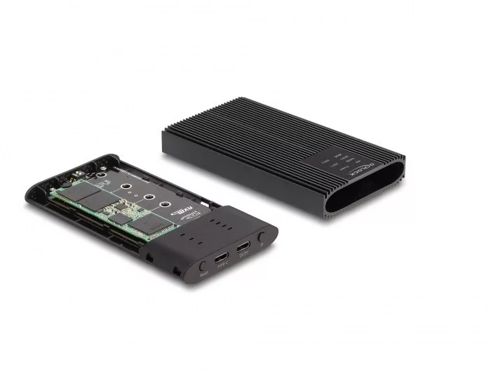 Leírás Ez a Delock alumínium ház lehetőséget ad két M.2 PCIe NVMe SSD telepítésére 2280, 2260, 2242 és 2230 formátumban. USB-n keresztül csatlakoztatható a számítógéphez vagy a laptophoz. A masszív fém keret hűtőelemekkel biztosítja a memória számára az ideális hőmérsékletet. M.2 PCIe SSD RAID Amennyiben két beépített SSD van lehetőség nyílik különböző RAID módok használatára. SSD beépítés eszköz nélkül Ennek a külső háznak az a különlegessége, hogy az M.2 SSD beszereléséhez nincs szükség szerszámokra. A fedő könnyen hátranyomható kis erővel, az SSD csatlakozni fog a PCB-hez egy gumi menettel és a fedő újracsatlakozik a teljes rázáródásig. Műszaki adatok Csatlakozó: külső: 1 x USB 20 Gbps USB Type-C hüvely 1 x USB Type-C hüvely (5 V tápellátás) belső: 2 x M.2 M-kulcs nyílás Lapkakészlet: JMicron JMS586R M.2 modulok használatát támogatja 2280, 2260, 2242 és 2230 formátumban PCIe (NVMe) alapú M- vagy B+M-kulccsal Az összetevők maximális magassága a modulon: A kétoldalas összeszerelt modulok 1,5 mm-es alkalmazása támogatott Támogatja a NVM Express (NVMe) használatát Támogatja a S.M.A.R.T. használatát Támogatja a UASP használatát Akár 20 Gbps sebességű adatátvitel 1 x be / kikapcsoló gomb 1 x reset gomb DIP kapcsoló RAID módhoz A RAID 0, RAID 1, JBOD, Port Multiplier támogatása 7 x LED jelzőfény Hot Plug, Plug & Play Rendszerindításra alkalmas Fémburkolat Szín: fekete Méretek (HxSzxM): kb. 120 x 68 x 17 mm A tápegység műszaki adatai Fali tápegység Bemenet: AC 100 ~ 240 V / 50 ~ 60 Hz / 0,6 A Kimenet: 5,0 V / 3,0 A / 15,0 W Rendszerkövetelmények Android 11.0 vagy újabb Chrome OS Linux Kernel 5.15 vagy újabb Mac OS 13.1 vagy újabb Windows 10/10-64/11 iPad Air (4. generáció) vagy újabb iPad Pro (3. generáció) vagy újabb Surface Pro 7 Egy szabad USB Type-C porttal vagy egy szabad Thunderbolt 3 porttal rendelkező eszköz vagy Thunderbolt 4 A csomag tartalma Külső ház Kábel USB-C csatlakozódugóval és USB-C csatlakozódugóval, hossza kb. 45 cm Kábel USB-C csatlakozódugóval és USB A-típusú csatlakozódugóval, hossza kb. 45 cm Külső tápegység 2 x hővezető betét 2 x hővezető lemez 4 x gumi csődugó Használati utasítás Csomag Retail Box