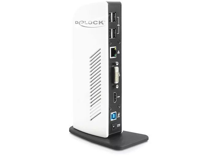 Ez a Delock portreplikátor egy egyszerű USB porthoz csatlakoztatható, és így számos interfésszel bővítheti ki rendszerét, mint például USB, audio, Gigabit Ethernet, DVI és HDMI. A DVI és HDMI portok lehetővé teszik két monitor csatlakoztatását. A portreplikátor kezeli a HD felbontást 2048 x 1152-ig.