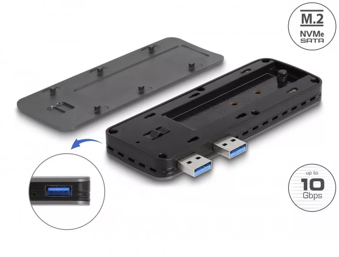 Leírás Ez a Delock ház lehetővé teszi egy M.2 PCIe NVMe SSD telepítését 2280, 2260 és 2242 formátumban. Közvetlenül csatlakozik a PS5 -höz a két USB Type-A csatlakozóval. A robusztus fémház oldalsó szellőzőnyílásokkal biztosítja a memória optimális hőmérsékletét. Kiegészítő A típusú USB-port Ez a port közvetlenül a PlayStation -ről van továbbítva. Így a házon lévő USB Type-A port továbbra is használható további USB-eszközök csatlakoztatására vagy a játékkonzol vezérlőjének töltésére . USB-hosszabbító kábel A mellékelt hosszabbítókábellel a ház PlayStation 4-hez csatlakoztathatóés így a játékokat az M.2 SSD-re másoljuk, hogy a PS5-ön használjuk őket. Ezenkívül a kábel segítségével a házat PC-hez vagy laptophoz csatlakoztathatja. SSD beszerelés szerszámok nélkül Ennek a háznak a különlegessége, hogy az M.2 SSD telepítéséhez nincs szükség szerszámra . A fedelet enyhe nyomással hátra lehet tolni, az SSD-t gumi csonkkal rögzítjük a NYÁK-hoz, majd a fedelet reteszelésig visszahelyezzük. Leírás Csatlakozók: külső: 2 db SuperSpeed ??USB 10 Gbps (USB 3.2 Gen 2) Type-A dugó 1 x SuperSpeed ??USB 10 Gbps (USB 3.2 Gen 2) Type-A anya belső: 1 x 67 pin M.2 key M slot Támogatja az M.2 modulokat 2280, 2260 és 2242 formátumban M vagy B+M kulccsal SATA vagy PCIe (NVMe) alapján A komponensek maximális magassága a modulon: 1,5 mm, kétoldalas összeszerelt modulok alkalmazása támogatott Támogatja az NVM Express-t (NVMe) Támogatja az UASP-t Támogatja a TRIM -et Támogatja a SMART -ot Adatátviteli sebesség 10 Gbps-ig LED-es jelzőfény a tápellátáshoz és a hozzáféréshez Fém ház Méretek (HxWxH): kb. 120 x 45 x 15 mm Hot Plug, Plug & Play Rendszerkövetelmények PlayStation 5 PlayStation 4 (kábellel) Windows 10/10-64/11 PC vagy laptop ingyenes USB Type-A porttal A csomag tartalma Külső ház M.2 USB-kábel A-típusú dugastól A-típusú anyáig, hossza kb. 30 cm 2 x hővezető betét 1 x hővezető lemez 2 x gumi mellbimbó Felhasználói kézikönyv Csomag Kiskereskedelmi doboz