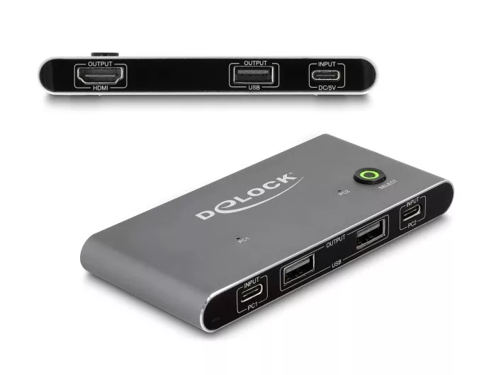 Leírás Ez a Delock KVM kapcsoló egy kényelmes megoldás arra, hogy összekössön két számítógépet USB-C DP Alt Mode kimenettel egy HDMI monitorhoz. A kapcsoló használatával válthat a két számítógép között. Perifériák Továbbá, három USB 2.0 port csatlakoztatható egérhez és klaviatúrához vagy USB-s táregységhez. USB tápellátás Az eszközt USB porton keresztül lehet tölteni, egy alkalmas USB kábel csatolva van. Amennyiben nincs szabad A-típusú USB port, egy opcionális külső tápellátás szükséges. Műszaki adatok Csatlakozó: Bemenet: 2 x USB Type-C (DP Alt Mode) hüvely 1 x USB Type-C hüvely (5 V tápellátás) Kimenet: 1 x HDMI-A hüvely 3 x USB 2.0 A-típusú hüvely Kapcsoló gomb LED forráskijelző Felbontás: 7680 x 4320 @ 60 Hz 3840 x 2160 @ 144 Hz (a rendszertől és csatlakoztatott hardvertől függően) Fémburkolat Szín: antracit Méretek (HxSzxM): kb. 115 x 54 x 12 mm Operációs rendszertől független, illesztőprogram telepítése nem szükséges Rendszerkövetelmények Asztali vagy hordozható számítógép szabad USB Type-C porttal és DisplayPort váltakozó móddal vagy Asztali vagy hordozható számítógép szabad Thunderbolt 3 porttal Monitor vagy televízió HDMI-csatlakozóval HDMI-kábel Áramforrás egy szabad USB A-típusú anya csatlakozó A csomag tartalma KVM kapcsoló USB 2 x Kábel USB-C csatlakozódugóval és USB-C csatlakozódugóval, hossza kb. 80 cm Kábel USB-C csatlakozódugóval és USB A-típusú csatlakozódugóval, hossza kb. 100 cm (tápellátás) Használati utasítás Csomag Retail Box