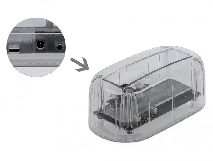 Ez a Delock Dokkoló Állomás lehetővé teszi egy 2.5 vagy 3.5 -os SATA merevlemez vagy SSD külső csatlakoztatását az USB-C interfészen keresztül. Ez a megoldás nem igényel külső házat, mivel a meghajtó közvetlenül csatlakoztatható a dokkolóegységhez. A mellékelt USB kábelek biztosítják a kapcsolatot egy szabad A vagy USB Type-C porton keresztül.
