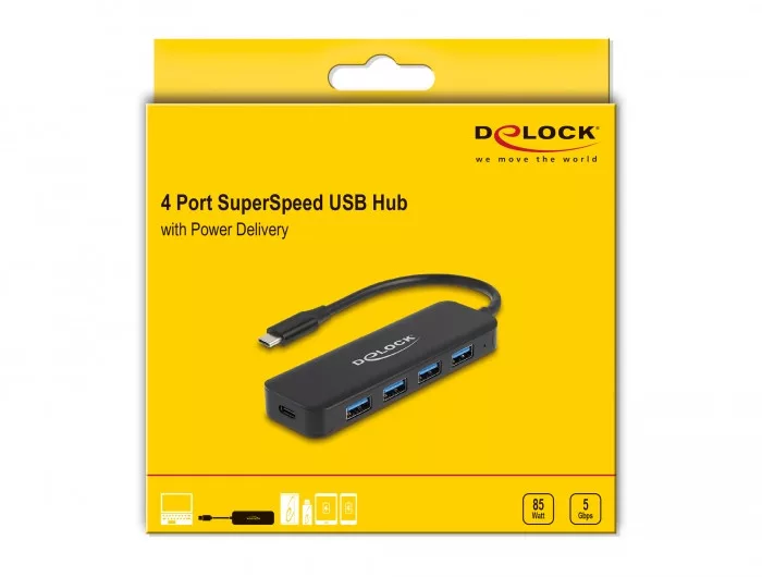 Ez a kompakt Delock USB hub fémvázzal összeköthető egy számítógép, laptop vagy mobil eszköz USB Type-C csatlakozó felületével. Az elosztóhoz akár 4 A-típusú USB eszköz is csatlakoztatható.