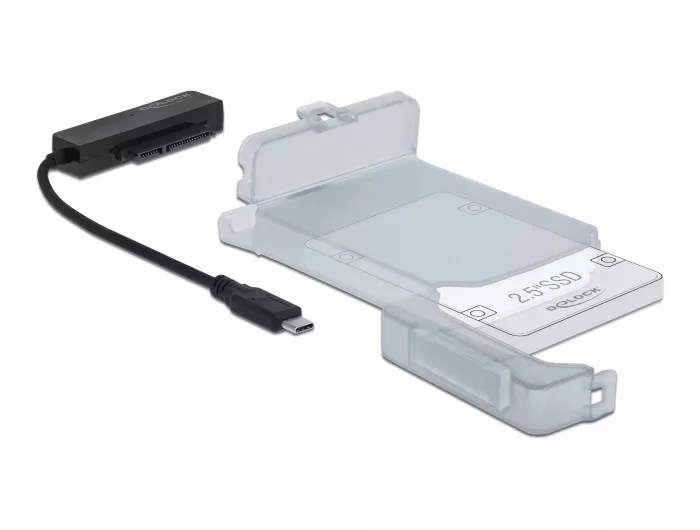 Ez a Delock átalakító USB-C csatolón keresztül asztali vagy hordozható számítógéphez csatlakoztatható. Ennek köszönhetoen egy 2.5 SATA HDD vagy SSD használható egy 22 tus SATA-csatolóval.