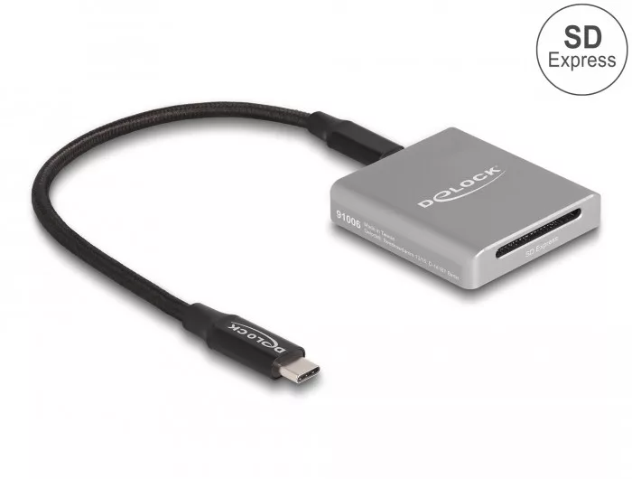 A Delock kártyaolvasó használható SD Express memóriakártyák olvasásához és írásához. A kártyaolvasó asztali vagy hordozható számítógéphez csatlakoztatható az USB Type-C -csatolón keresztül.