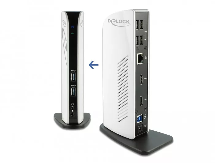 Ez a Delock dokkoló állomás összeköthető egy személyi számítógéppel egy USB-C vagy egy A-típusú USB porton keresztül és számos csatlakozási felület biztosít így. Két képernyőt lehet párhuzamosan működtetni a HDMI kimeneti portokon át. Négy beépített USB 2.0 port és két USB 3.2 Gen 1 port ad lehetőséget perifériák használatára. Továbbá mikrofon-, hangfal- és Gigabit hálózati kapcsolat lehetősége egészíti ki a dokkoló állomás szolgáltatásait.