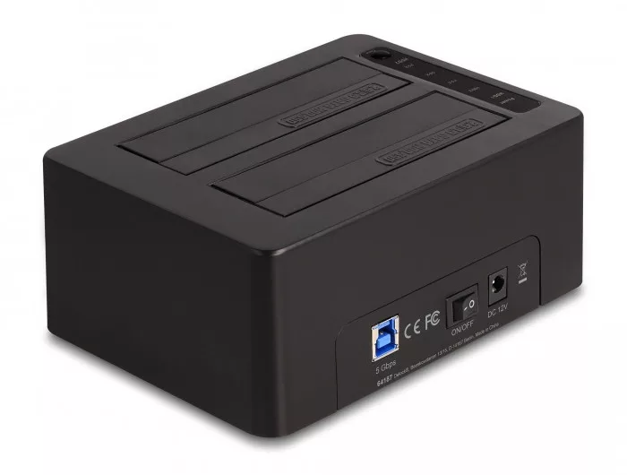 Leírás Ez a Delock Dokkoló Állomás lehetővé teszi maximum két 2.5 vagy 3.5 -os SATA merevlemez vagy SSD külső csatlakoztatását az USB interfészen keresztül. Ez a megoldás nem igényel külső házat, mivel a meghajtó közvetlenül csatlakoztatható a dokkolóállomáshoz. Klónozó és törlő funkció A klón funkció lehetővé teszi, hogy egy HDD tartalmát átmásoljuk egy másikra anélkül, hogy személyi számítógépet használnánk a folyamathoz. Nem szükséges csatlakoztatni a számítógéphez a törlő funkció használatához sem. Külön egy-egy vagy egy időben két meghajtó is törölhető. Műszaki adatok Csatlakozó: 1 x USB 5 Gbps B-típusú hüvely 2 x 22 érintkezős SATA 6 Gb/s hüvely 1 x DC aljzat Lapkakészlet: Asmedia ASM1156 Funkció gomb: 1 x klónozó gomb 1 x törlés gomb 1 x főkapcsoló Törlési folyamat: felülírja az egész memóriát a "0" gombbal 2.5 és 3.5 SATA HDD / SSD számára Valamennyi SATA meghajtóhoz alkalmas, legfeljebb SATA 6 Gb/s adatátviteli sebességig Akár 5 Gbps sebességű adatátvitel LED jelzés mutatja a tápellátást és a másolási / törlési állapotot Méretek (HxSzxM): kb. 153 x 110 x 62 mm Plug & Play A tápegység műszaki adatai Fali tápegység Bemenet: AC 100 ~ 240 V / 50 ~ 60 Hz / 1,5 A Kimenet: 12,0 V / 3,0 A Földelés kívül, pozitív belül Méret: belül: o kb. 2,1 mm kívül: o kb. 5,5 mm hosszúság: kb. 10 mm Rendszerkövetelmények Chrome OS Linux Kernel 5.13 vagy újabb Mac OS 12.4 vagy újabb Windows 8.1/8.1-64/10/10-64/11 PC vagy notebook számítógép szabad USB A-típusú-csatlakozóval A csomag tartalma Dokkolóállomás Kábel USB A-típusú apa USB B-típusú apa, hosszúsága kb. 80 cm Külső tápegység 12,0 V / 3,0 A Használati utasítás Csomag Retail Box