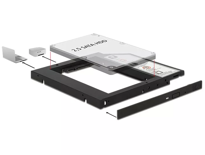 Ez a Delock vékony kialakítású szerelokeret a számítógép szabad 5.25 -es SATA vékony bovítohelyére szerelheto, így 2.5 -es SATA HDD illesztheto bele.