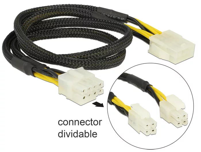 Ez a Delock által gyártott tápkábel a 8 tűs EPS interfész meghosszabbításaként használható, és pl. az alaplap csatlakoztatására alkalmazható. Továbbá a 8 tűs EPS hím csatlakozó két 4 tűs hím csatlakozóra osztható. Így az alaplap 4 tűs csatlakozóján keresztül is biztosíthatja a tápellátást.