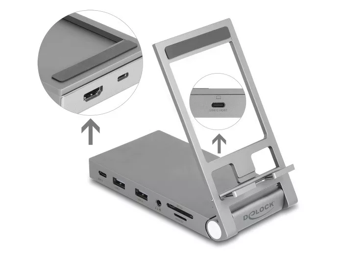 Leírás Ez a Delock dokkoló állomás tartóval tabletek és laptopok számára nemcsak kialakításával, de stabilitásával és funkcionalitásával is meggyőző. A termék alján és tartó részeinél lévő gumírozott párnák biztosítják, hogy se a tablet vagy laptop, se maga az állvány ne csússzon meg. Ideális még hosszú video hívásokhoz vagy sorozat maratonokhoz A tartó mélyedésnek köszönhetően a tablet tölthető is függőleges pozícióban tartva. Ez ideálissá teszi az állványt hosszú videós vagy skype video hívásokra, valamint sorozat maratonokhoz. Dokkolóállomás A dokkoló állomás összeköthető egy mobil eszközzel USB-C DP Alt Mode vagy Thunderbolt 3 port segítségével és számtalan csatlakozási felület biztosít. Egy képernyő maximálisan akár 4K 60 Hz felbontással üzemeltethető a HDMI kimeneten. Beépített USB portok lehetővé teszik a perifériás eszközök használatát és egy fejhallgató csatlakoztatását, valamint egy SD vagy Micro SD kártya csatlakoztató egészíti ki az eszköz szolgáltatásait. Az USB tápellátást (USB PD 3.0) akár 60 wattig is támogatja A dokkoló állomás rendelkezik egy USB Type-C tápszolgáltató (Power Delivery) porttal. Amennyiben ehhez a csatlakozó felülethez egy laptop vagy tablet tápellátást hozzákötjük a fogadó eszköz akár 60 wattal töltődik használat közben. Megjegyzés Samsung DeX támogatása Műszaki adatok Csatlakozó: 1 x USB Type-C dugó 1 x USB 5 Gbps USB Type-C hüvely 2 x USB 5 Gbps A-típusú hüvely 1 x HDMI hüvely 1 x USB Type-C hüvely (tápellátás) 1 x 3,5 mm-es, 4 tűs fejhallgató-aljzat 1 x SD-nyílás 1 x Micro SD-nyílás Felbontás: max. 3840 x 2160 @ 60 Hz (a rendszertől és csatlakoztatott hardvertől függően) Hang- és videojelek továbbítása Kimeneti teljesítmény: 1 x USB Type-C csatlakozóhüvely (max. 60 W) Támogatja a HDCP használatát Fémburkolat Szín: szürke Tömeg: kb. 316 g Méretek (HxSzxM): kb. 138 x 70 x 28 mm Kábelhosszúság csatlakozó nélkül: kb. 24 cm Akár 14 laptopokhoz és tabletekhez Rendszerkövetelmények Android 11.0 vagy újabb Chrome OS iPad Air (4. generáció) vagy újabb iPad Pro (2018) Mac OS 12.4 vagy újabb Windows 10/10-64/11 Egy szabad USB Type-C porttal és DisplayPort váltakozó móddal vagy egy szabad Thunderbolt 3 porttal rendelkező eszköz A csomag tartalma Állvány dokkoló állomással Kábel USB-C csatlakozódugóval és USB-C csatlakozódugóval, hossza kb. 25 cm Használati utasítás Csomag Retail Box