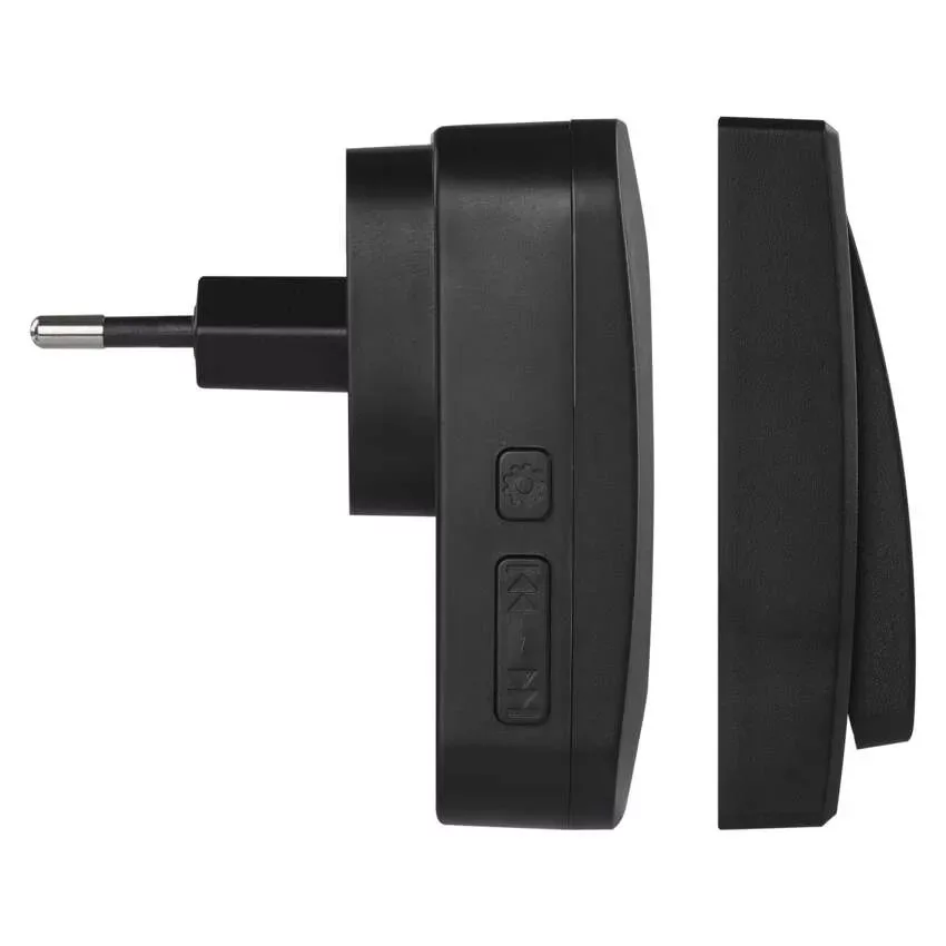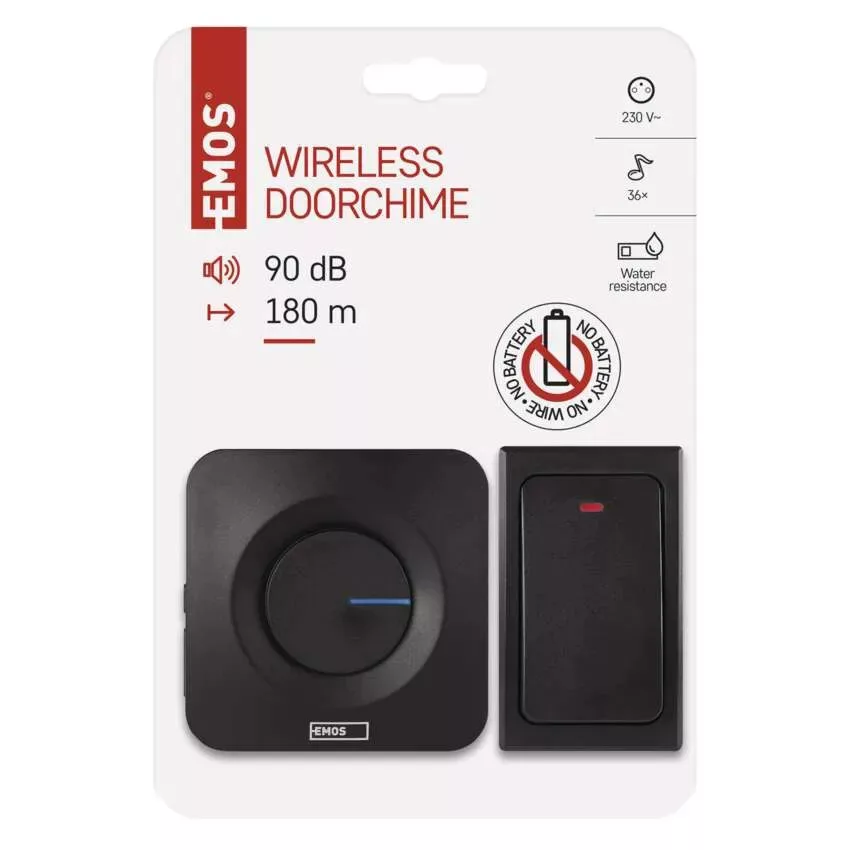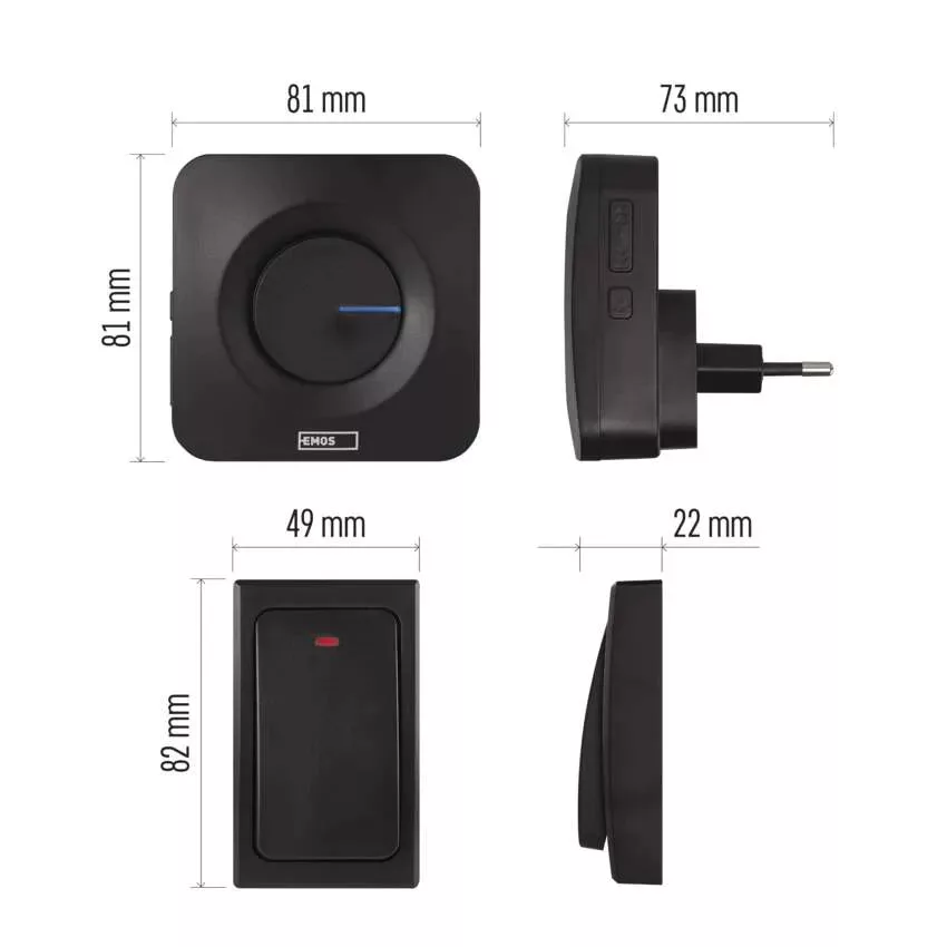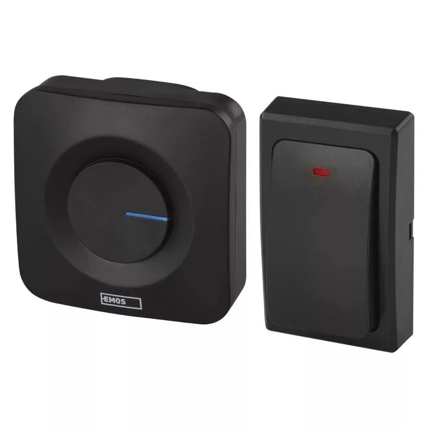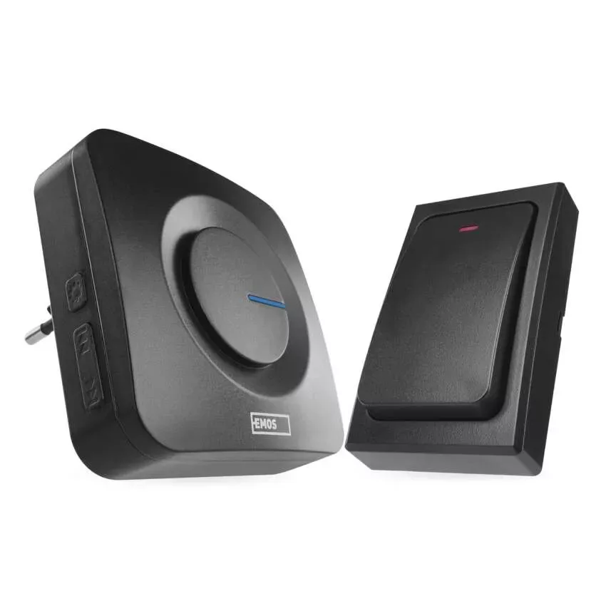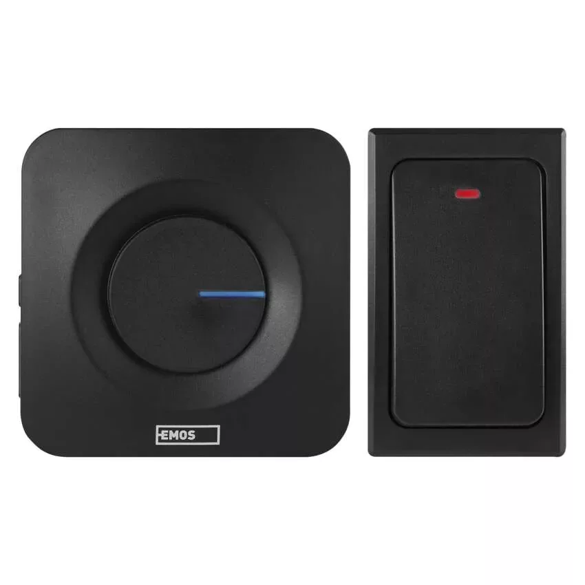 A modern, elegáns fekete színű EMOS ajtócsengő lekerekített formákkal rendelkezik, és két LED világít a világba, hogy jelezze hibátlan működését.