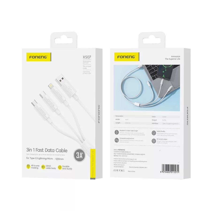 A Foneng Series 3 az 1-ben USB-kábel egy kiváló minőségű, sokoldalú kiegészítő, amelyet kifejezetten a modern igényeket szem előtt tartva terveztek.