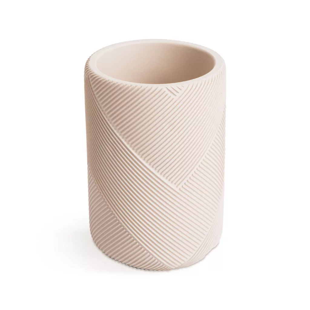Ha a letisztult eleganciára és a modern designra vágyik, akkor ez a matt bézs fürdőszobai pohár tökéletes választás lehet. A matt bézs színű, mintás felület modern és elegáns jegyekkel ruházza fel a fürdőszobai enteriőrt. A gyantából készült pohár nem csak a megjelenésével fogja elvarázsolni, hanem tartósságával és praktikusságával is. Az anyagot könnyű tisztíthatóság jellemzi. A kompakt méretű pohár könnyedén elfér a mosdó környékén vagy a fürdőszoba polcán, így mindig kéznél lesz, amikor szüksége van rá. Legyen szó fogkeféről, fogkrémről vagy más apróságokról, ebben a fürdőszobai pohárban mindent stílusosan és rendezetten tárolhat.