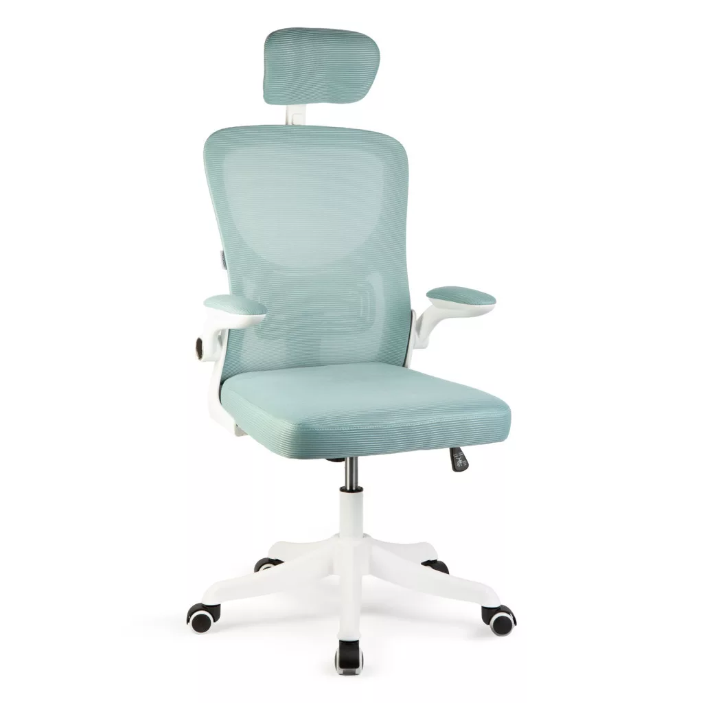 Modern megjelenésű, kényelmes irodai forgószék fehér/kék színben, amely ideális választás otthoni vagy munkahelyi környezetbe. Ergonomikus kialakításának és állítható magasságának köszönhetően hosszabb ülések esetén is komfortos használatot biztosít. A háttámla és a karfák erős, de rugalmas anyagból készültek, míg az ülőfelület strapabíró rétegelt lemezre épül. A kényelmes használat érdekében a karfák felhajthatóak. A szék pillangómechanikával, gázlifttel, masszív, műanyag lábcsillaggal és strapabíró görgőkkel van ellátva, amelyek stabilitást és tartósságot garantálnak.